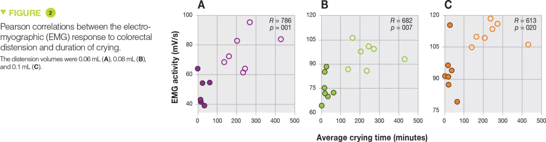 Rectal faecal transplant enemas from colicky infants induced significant visceral hypersensitivity during rectal distension with larger volumes (+55%, p <0.001 with 0.06 mL; +27%, p <0.001 with 0.08 mL, and +19%, p <0.001 with 0.1 mL) (Figure 1), as well as a better overall response (increase in area under the curve by +33%, p <0.001). In addition, there was a positive correlation between the duration of crying and these distension volumes (Figure 2).
