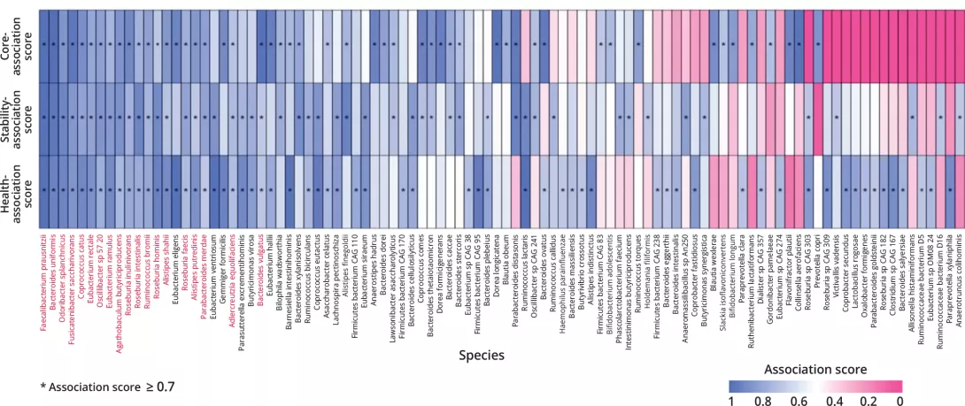 Using a discovery cohort comprising 39,926 gut microbiomes from 127 cohorts (including cross-sectional and longitudinal data, spanning 42 countries and 28 different diseases), the authors generated a ranking of 201 prevalent (core) gut microbiota taxa (those detected in ≥ 5% of samples in ≥ 50% of the studied cohorts), the HACK index (Health-Associated Core Keystone Index), each being assigned a score based on three quantifiable properties: i) prevalence/community association in non-diseased subjects; ii) temporal stability; and iii) negative association with disease.