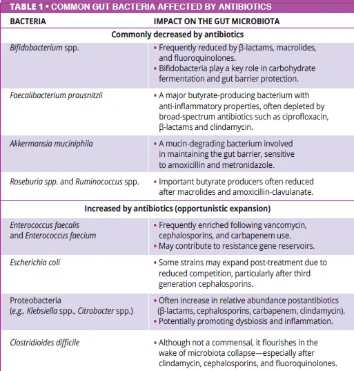 Antibiotics are well known to disrupt the gut microbiota by reducing diversity, altering composition, and promoting resistant strains (table 1) 5, 6. Van Zyl et al. found that antibiotics especially quinolones and β-lactams consistently disrupt microbial communities across body sites, with combination regimens causing prolonged dysbiosis and increased pathogenic burden 5. Similarly, Maier et al. showed that different antibiotic classes have distinct effects on gut bacteria, with macrolides and tetracyclines causing sustained losses in anaerobes, and drugs like amoxicillin and ceftriaxone shifting populations toward Proteobacteria. Despite individual variability, a common trend emerged: depletion of obligate anaerobes (e.g., Firmicutes) and enrichment of facultative and potentially pathogenic microorganisms 6.