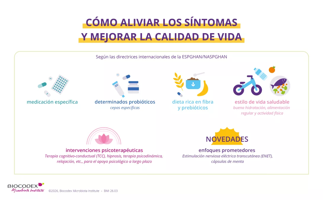 El tratamiento de los niños que padecen un SII puede incluir estrategias no farmacológicas (dieta alimentaria, intervenciones psicológicas, fibras específicas y probióticos), así como estrategias farmacológicas, siempre que se adapten a los síntomas del paciente, lo cual requiere a menudo un enfoque multidisciplinario. 8