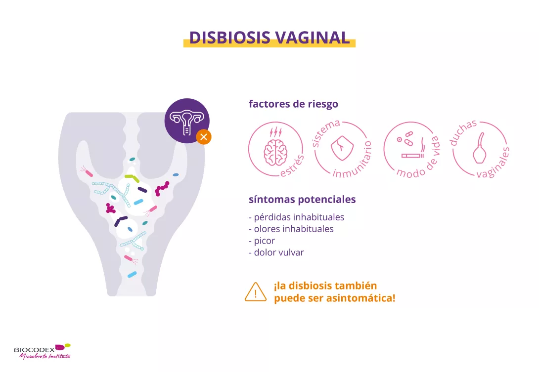 La disbiosis vaginal se caracteriza por la pérdida de predominio de los lactobacilos en la flora vaginal, abriendo el camino a la colonización de la vagina por parte de microorganismos oportunistas.8,11 Su presencia se acompaña frecuentemente de secreción vaginal, prurito y ardor, o de un olor a pescado, aunque también puede ser asintomática.8