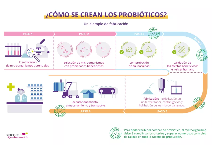 La fabricación de los probióticos exige el dominio de un procedimiento técnico delicado y controles estrictos repetidos en cada etapa de la cadena de producción. En efecto, debe garantizar al consumidor un producto final que cumpla todas las normas de calidad y seguridad. Los microorganismos probióticos deben mantenerse vivos, en número suficiente y estable hasta el final del periodo de conservación del producto, dosificarse correctamente para el beneficio previsto y carecer de contaminantes.5,6,51