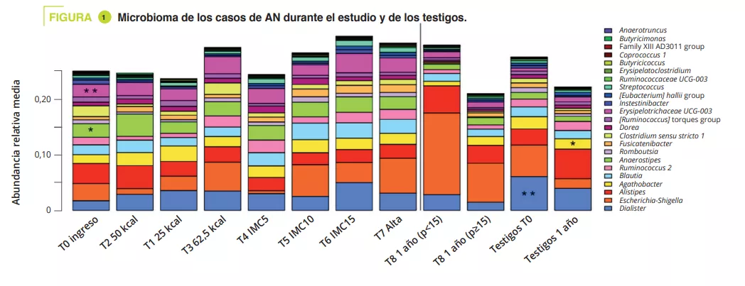 Existe una disbiosis en la fase aguda de la AN que mejora en parte gracias al abordaje. La composición del MI en el momento del ingreso puede ayudar a predecir el riesgo de recaída durante el primer año y de mejora del IMC al año. Por ello, es posible que el análisis del MI en el momento del ingreso pueda ayudar a identificar los géneros y taxones Parasutturella, Lachnospiraceae FCS020 group, Clostridium stricto sensu y Alistipes no cultivadas como factores de mal pronóstico. Como una mayor abundancia de Sutterella fue un indicador de evolución favorable, podría ser un objetivo como probiótico.