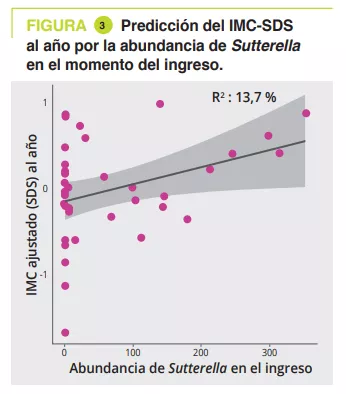 El análisis del MI en el momento del ingreso demostró una asociación significativa entre la duración de la enfermedad (a nivel de filo a familia, p = 0,011 a 0,022) y la cantidad de pérdida de peso (nivel de clase a género, p = 0,030 a 0,047). El análisis longitudinal PERMANOVA, con corrección por la toma de laxantes, mostró una asociación significativa entre el MI y la ingesta calórica (p = 0,003,R2 = 0,009), el IMC-SDS (p = 0,006, R2= 0,008) y la leptina medida al ingreso, al alta hospitalaria y al año (p = 0,02, R2 = 0,02). Los géneros Ruminiclostridium 5 (p = 0,006) e Intestinibacter (p = 0,03) se asociaron con el riesgo de rehospitalización. Un modelo de análisis lineal, corregido por la toma de laxantes, la duración de la enfermedad, la pérdida de peso y el IMC-SDS al ingreso, mostró que había 4 géneros en el momento del ingreso asociados con el IMC-SDS en el seguimiento al año: Sutterella, Parasutturella, Lachnospiraceae FCS020 group y Clostridium stricto sensu (p = 0,008 a 0,04) (figura 3).