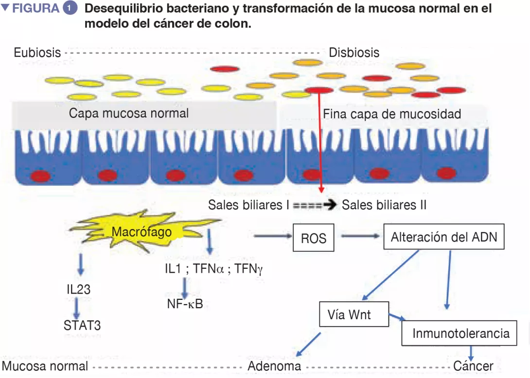 Disbiosis cólica ligada al CCR [3, 4], la hipótesis de que la flora oral participaba en la disbiosis implicada en la génesis del CCR se ha reactualizado a la luz de los trabajos originales sobre la capacidad de ciertas bacterias orales para superar el filtro gástrico y de participar en la disbiosis cólica [5]. Los desequilibrios bacterianos se producen a menudo en detrimento de bacterias beneficiosas como Bifidobacteria y Lactobacilli, que contribuyen a mantener la respuesta inmune [2]. Cuando estas bacterias ya no pueden hacer de contrapeso frente a las bacterias proinflamatorias, se instala una inflamación crónica asintomática de la mucosa cólica, conocida desde hace tiempo por favorecer el proceso carcinógeno. Últimamente, se considera que la alimentación actual de tipo occidental (demasiado rica en proteínas animales y en azúcares) favorece las bacterias proinflamatorias en detrimento de bacterias antinflamatorias. Y, al contrario, una alimentación de tipo mediterráneo (rica en fibras vegetales) limita los efectos nocivos [6]. A falta de un aporte suficiente de fibras, las bacterias reclutadas por el consumo excesivo de proteínas o de grasas animales erosionan la mucosidad, la utilizan como fuente de fibras, y exponen el epitelio intestinal a bacterias potencialmente virulentas (Figura 1). A escala celular, las grandes vías biológicas como la vía Wnt y la vía común NF-kB (nuclear factor-kappa B), que originan respectivamente la renovación celular y una mayor producción de citoquinas proinflamatorias, se estimulan gracias a esta alimentación [6]. Se puede asociar a este fenómeno una orientación de la respuesta inmune hacia la tolerancia debida a la sobreabundancia de otras bacterias como Parvimonas micra y Streptococcus fragilis [7]. En animales, Bacteroides fragilis o Escherichia coli, que forman parte del panel de bacterias sobreabundantes en caso de CCR en un estadio avanzado (III o IV de TNM), mantienen la estimulación inflamatoria en la mucosa cólica y favorecen la aparición de tumores [8].