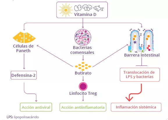 La función mejor caracterizada de la vitamina D es el control de las concentraciones de calcio y la salud ósea. Sin embargo, se sabe que también ejerce un efecto importante sobre las respuestas inmunes gastrointestinales. La vitamina D regula varios genes que a su vez regulan el funcionamiento de la barrera intestinal, así como genes que codifican péptidos antimicrobianos, contribuyendo así a mantener el equilibrio intestinal (Fig 5).33 La vitamina D ejerce efectos inmunomoduladores como la diferenciación y migración celulares y funciones antiinflamatorias.34 Además, puede actuar directamente en las células de Paneth para estimular la secreción de defensina-2.35 Por otra parte, la vitamina D favorece la diversidad de la composición de la microbiota intestinal, provocando un aumento de la producción de butirato. El butirato puede tener efectos antiinflamatorios, reforzar el funcionamiento de la barrera intestinal y estimular la secreción de defensinas por parte de las células de Paneth (Fig 5). Cabe notar que algunas bacterias probióticas (p.ej., cepas de Lactobacillus) aumentan las concentraciones sanguíneas de vitamina D.36