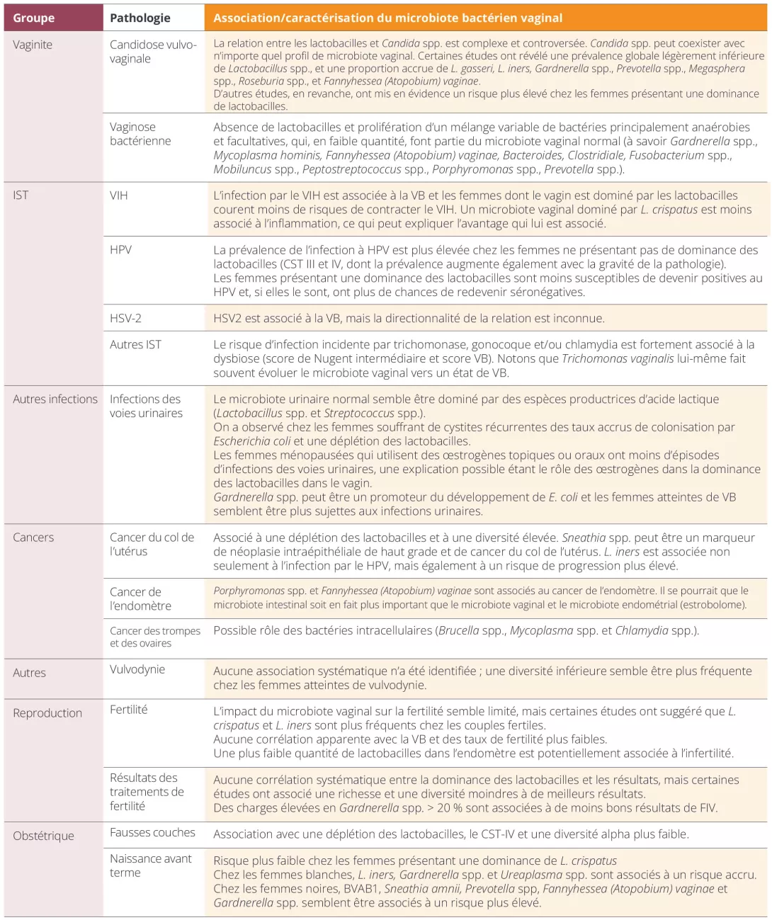 Tabla 1. Condiciones ginecológicas y obstétricas y sus asociaciones con el microbioma vaginal.