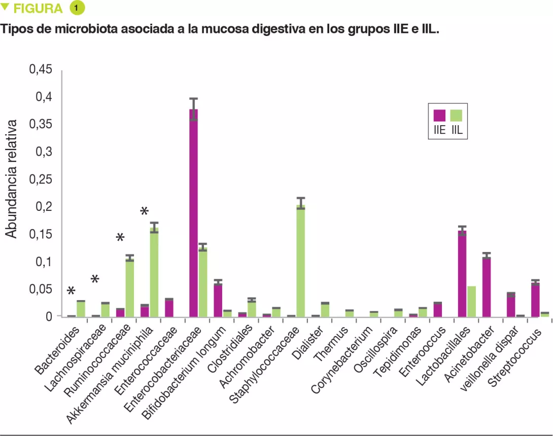 La MF presentaba una menor diversidad (índice de Shannon) en los pacientes con IIE que en los que tenían IIL (p = 0,01). La abundancia relativa fue similar a la MM entre IIE e IIL para las proteobacterias y firmicutes (p < 0,05). Asimismo, se encontró una distribución bacteriana con más Enterobacteriaceae en los pacientes con IIE y más Ruminococcaceae, Bacteroides, Lachnospiracee y Staphylococcaceae en los pacientes con IIL.