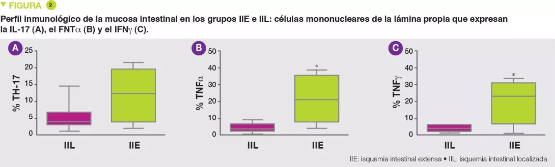 Catorce recién nacidos recibieron una resección intestinal a causa de una isquemia intestinal. Según la gravedad de las lesiones, se identificaron dos grupos: isquemia intestinal extensa (IIE) e isquemia intestinal localizada (IIL). Este estudio demostró la variación de la MF y de la MM en los grupos IIE e IIL.