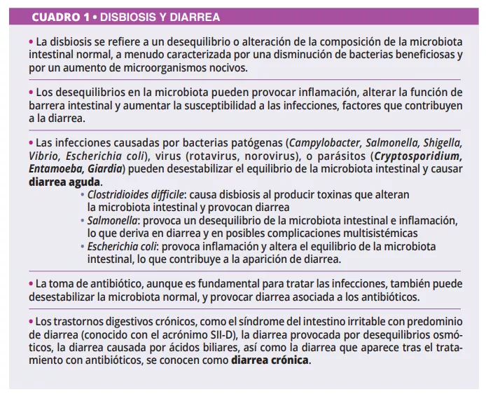 Los trastornos intestinales pueden presentar síntomas como heces frecuentes y líquidas, lo que se conoce como diarrea. Esta señal del aparato digestivo puede producirse por distintas razones, desde infecciones y reacciones a ciertos alimentos hasta reacciones adversas a medicamentos y enfermedades preexistentes (resumidas en [1]). La microbiota intestinal, es decir, el conjunto de microorganismos presentes en el intestino, es fundamental para preservar la salud digestiva y por su repercusión en el funcionamiento del intestino. Estudios recientes han ilustrado la relación entre la microbiota y la diarrea por causas diversas. Una microbiota equilibrada y diversa es fundamental para la salud digestiva general, la absorción de nutrientes y la regulación del sistema inmunitario. En la actualidad, hay una tendencia hacia la introducción a gran escala de formas de reprogramar la comunidad microbiana intestinal: prebióticos, probióticos y posbióticos o el trasplante de materia fecal para prevenir o tratar la diarrea. En un futuro próximo, la investigación sobre la modulación de la microbiota ofrecerá estrategias aplicables para la prevención y el tratamiento de la diarrea. A continuación, se repasan las principales enfermedades diarreicas relacionadas con la disbiosis y algunos aspectos de la gestión de la microbiota para mejorar estas afecciones gastrointestinales.