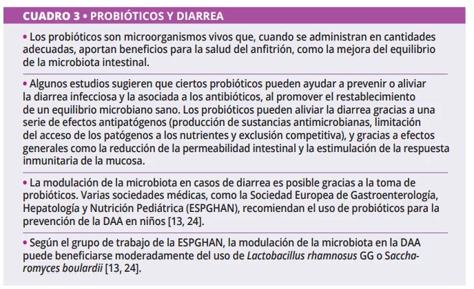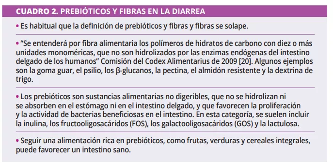 Hay pocos datos sobre los prebióticos y las fibras para el tratamiento de la diarrea (cuadro 2). Parece ser que los prebióticos son más indicados para prevenir y tratar las diarreas recidivantes. Al mismo tiempo, las fibras, principalmente las viscosas, están más indicadas durante los episodios agudos, debido a su capacidad de retención de agua. Otras opciones terapéuticas implican, en algunos casos, la toma de probióticos y (cuadro 3), en casos graves, el uso del trasplante de microbiota fecal (TMF).