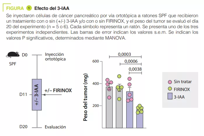 La microbiota intestinal repercute en la respuesta a la quimioterapia. Los mecanismos implicados en este estudio demuestran el papel de los metabolitos microbianos y, en particular, de los metabolitos del triptófano. Entre ellos, el 3-IAA no solo es un marcador predictivo de la respuesta a la quimioterapia en el PDAC, sino que también podría representar una molécula terapéutica adyuvante.