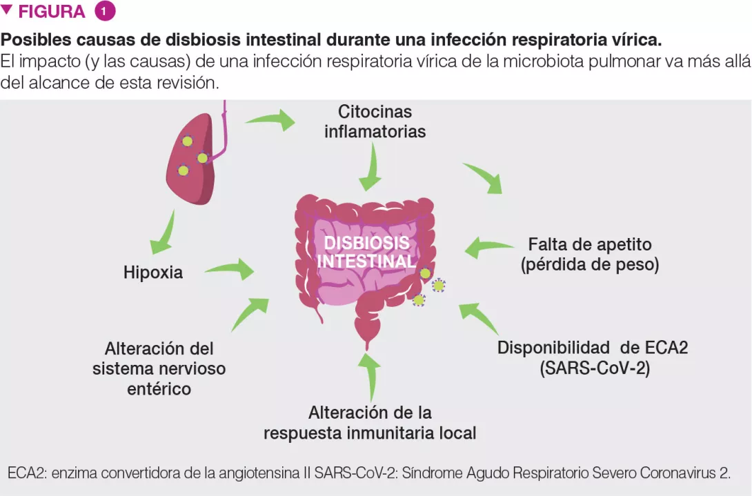 La nueva enfermedad del coronavirus 19 (SARS-CoV-2) (COVID-19) nos recuerda que las interacciones entre la microbiota intestinal y el sistema inmunitario son fundamentales durante las infecciones respiratorias víricas. Los virus respiratorios pueden desencadenar síntomas gastrointestinales, lo que pone de relieve la importancia del eje pulmón-intestino en la enfermedad. Estudios clínicos y modelos experimentales indican que las infecciones respiratorias víricas agudas alteran la composición y las funciones de la microbiota intestinal, un componente fundamental de la salud humana. En este artículo repasaremos estos importantes cambios y comentaremos las posibles causas de la disbiosis intestinal. Además, presentaremos las consecuencias de una disbiosis intestinal producida durante una infección sobre las consecuencias secundarias de la enfermedad. Por último, propondremos estrategias intervencionistas que podrían utilizarse para tratar la microbiota intestinal y reducir así la gravedad de la enfermedad respiratoria vírica.