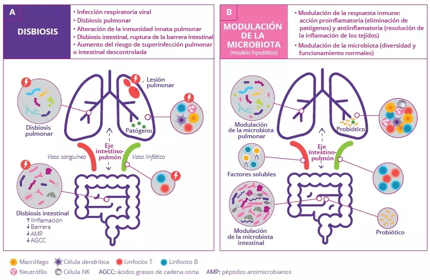 FIGURA 7: El eje intestino-pulmón durante la infección respiratoria viral (A) y el modelo de modulación de la microbiota con probióticos (B).