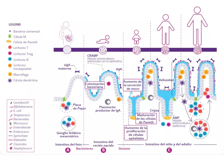 FIGURA 1: Desarrollo de la microbiota intestinal y del sistema inmunitario intestinal antes del nacimiento (A), antes del destete (B) y después del destete (C).
