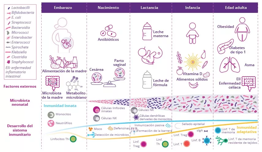 A lo largo del embarazo, los metabolitos microbianos (procedentes de la microbiota y la alimentación de la madre) influyen en el desarrollo del sistema inmunitario del feto. En el momento del parto, la colonización microbiana comienza en paralelo con el desarrollo del sistema inmunitario. En esa etapa, el recién nacido aún se encuentra bajo la protección materna que le brinda la lactancia dado que la leche materna contiene antígenos bacterianos derivados de la madre que estimulan la maduración del sistema inmunitario mucoso innato. En cuanto a la colonización de la microbiota intestinal, las familias bacterianas predominantes durante las primeras semanas de vida son Enterococcacae, Clostridiaceae, Lactobacillaceae, Bifidobacteriaceae y Streptococcaceae. La introducción de alimentos sólidos en la alimentación del bebé aumenta la diversidad de la microbiota intestinal, la cual se va convirtiendo paulatinamente en una microbiota cada vez más cercana a la de adultos, con una menor abundancia de Bifidobacteriaceae y una mayor abundancia de Bacteroides, Ruminococcus y Clostridium. El tipo de parto, la leche materna, los alimentos sólidos y el tratamiento con antibióticos son factores que moldean la microbiota y el sistema inmunitario del recién nacido.