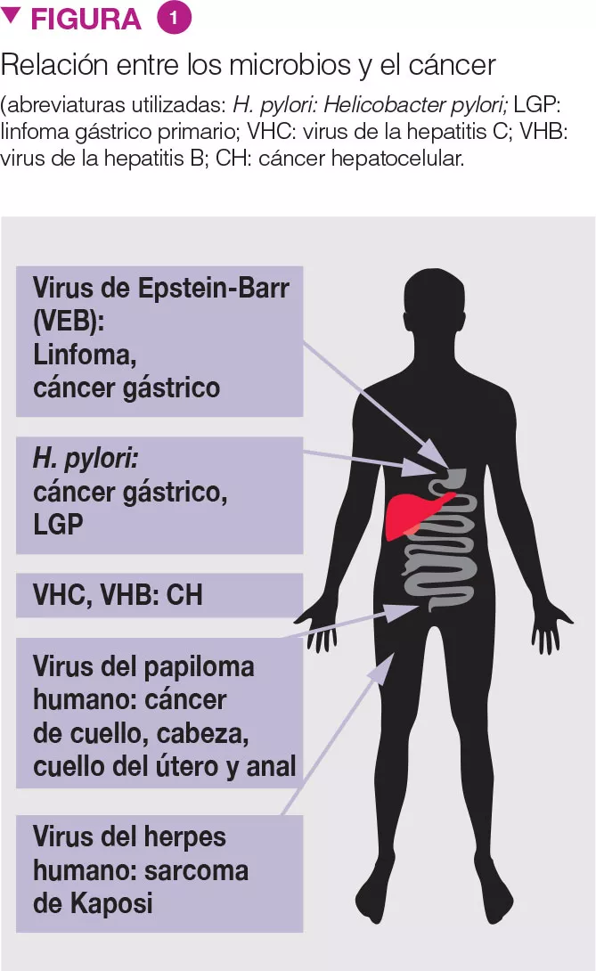 La asociación entre microorganismos y cáncer es conocida (Fig. 1) [3]. Recientemente, nuevos datos sugieren el rol de la disbiosis en el CCR. La microbiota fecal de pacientes con pólipos de colon se parece a la de pacientes con CCR. Mientras que Clostridium spp., Bacteroides spp. y Bifidobacterium spp. están asociados al CCR, las bacterias productoras de ácido láctico (p. ej., Lactobacillus spp. y Eubacterium aerofaciens) están negativamente asociadas con el CCR. La producción de metano y de H2S (sulfuro de hidrógeno) asociada a la MI, y la presencia de Streptococcus bovis, podrían desempeñar una función en el desarrollo del CCR. Además, se ha sugerido que la obesidad podría estar relacionada con la MI, y esta constituir un factor predisponente de CCR.