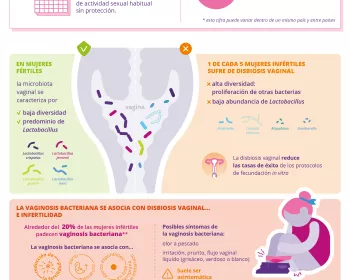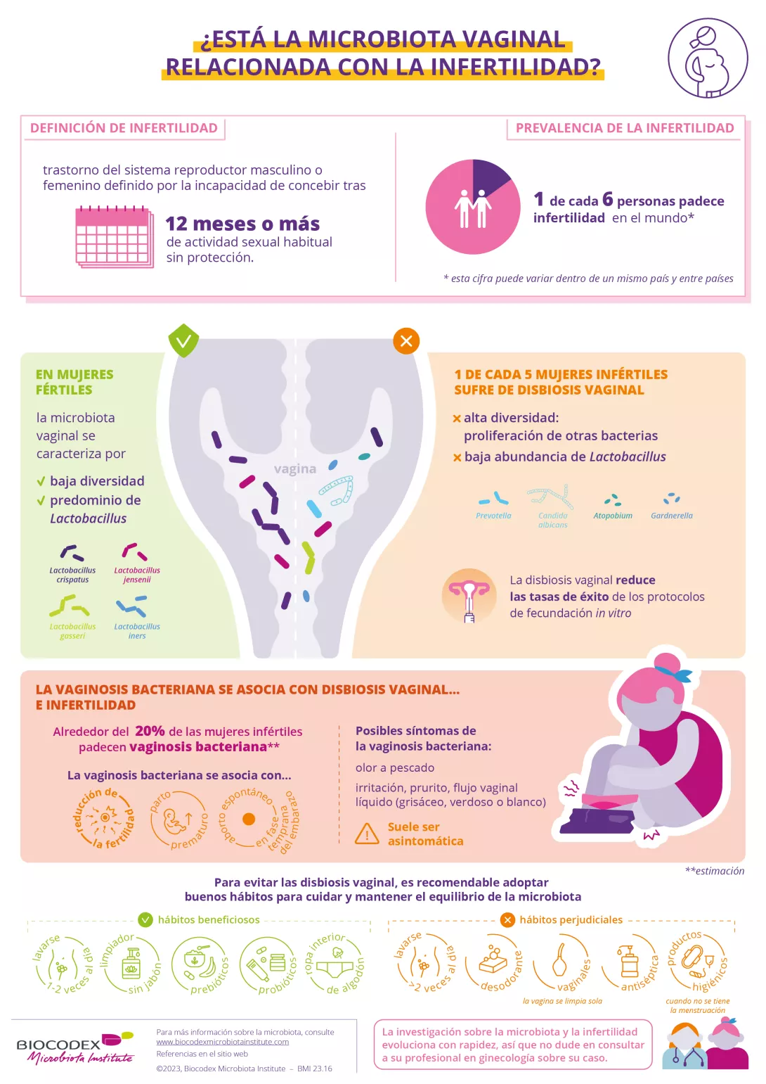 Esta infografía destaca la relación entre la microbiota y la fertilidad, resaltando la importancia de mantener un ecosistema equilibrado mediante una higiene adecuada y la educación de las pacientes.