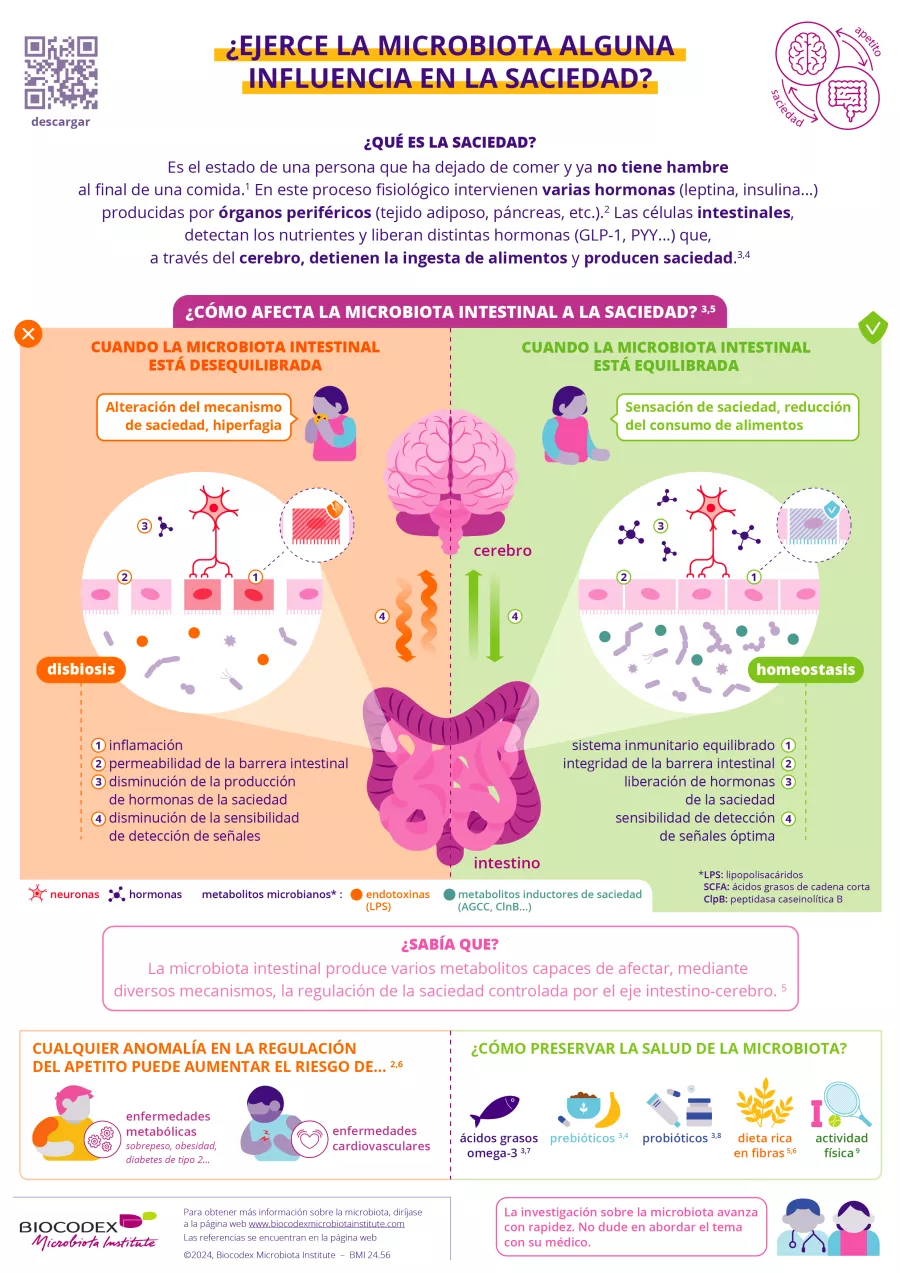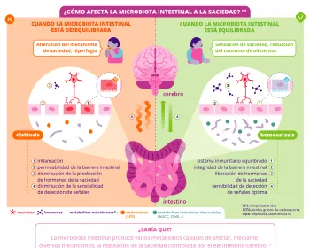 Esta infografía ayuda a los profesionales de la salud a explicar a sus pacientes cómo la microbiota intestinal influye en la saciedad.