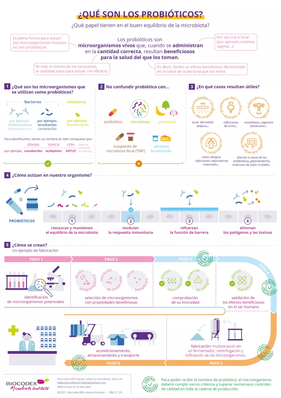 Esta infografía explica qué son los probióticos y cómo ayudan a mantener el equilibrio de la microbiota, favoreciendo la salud en general.
