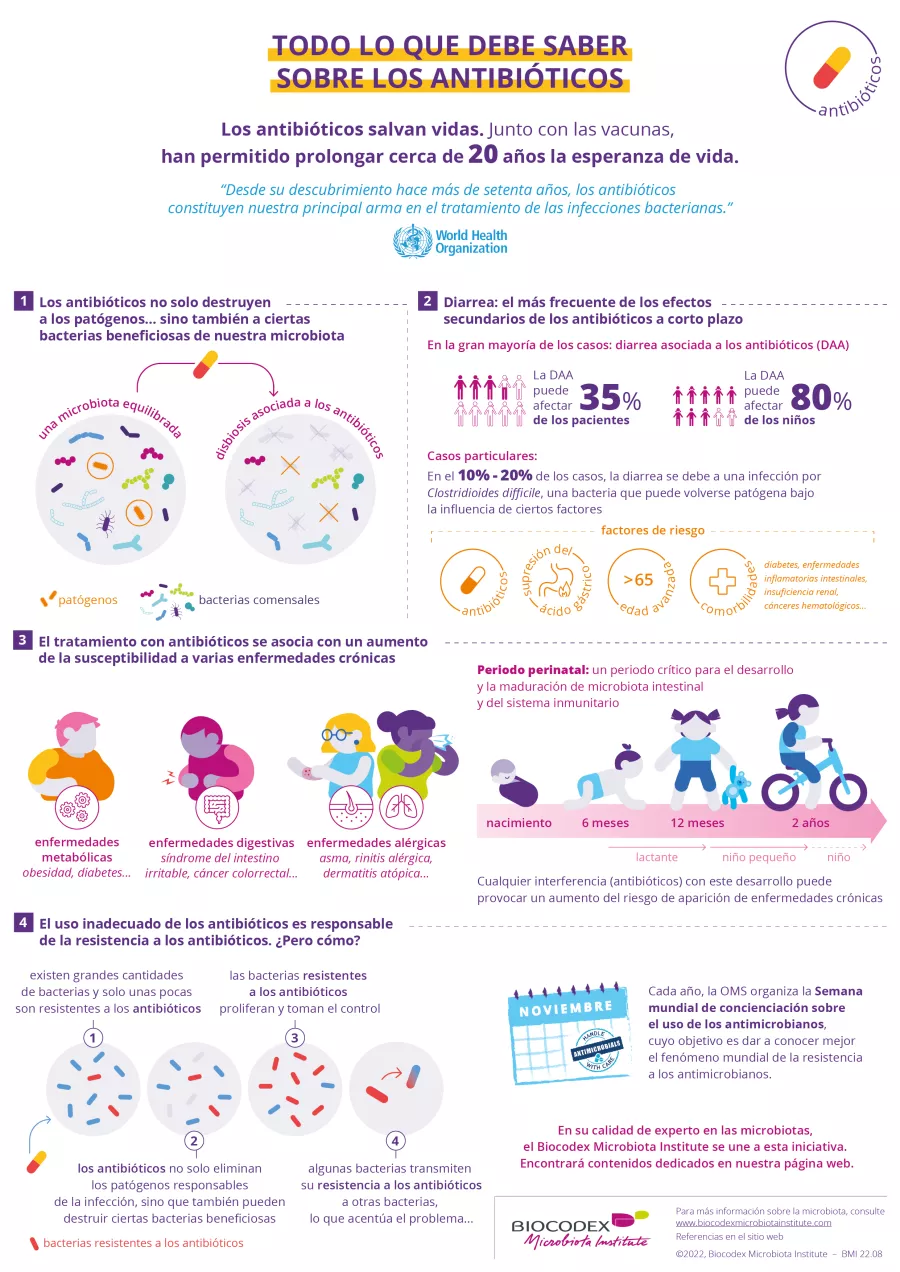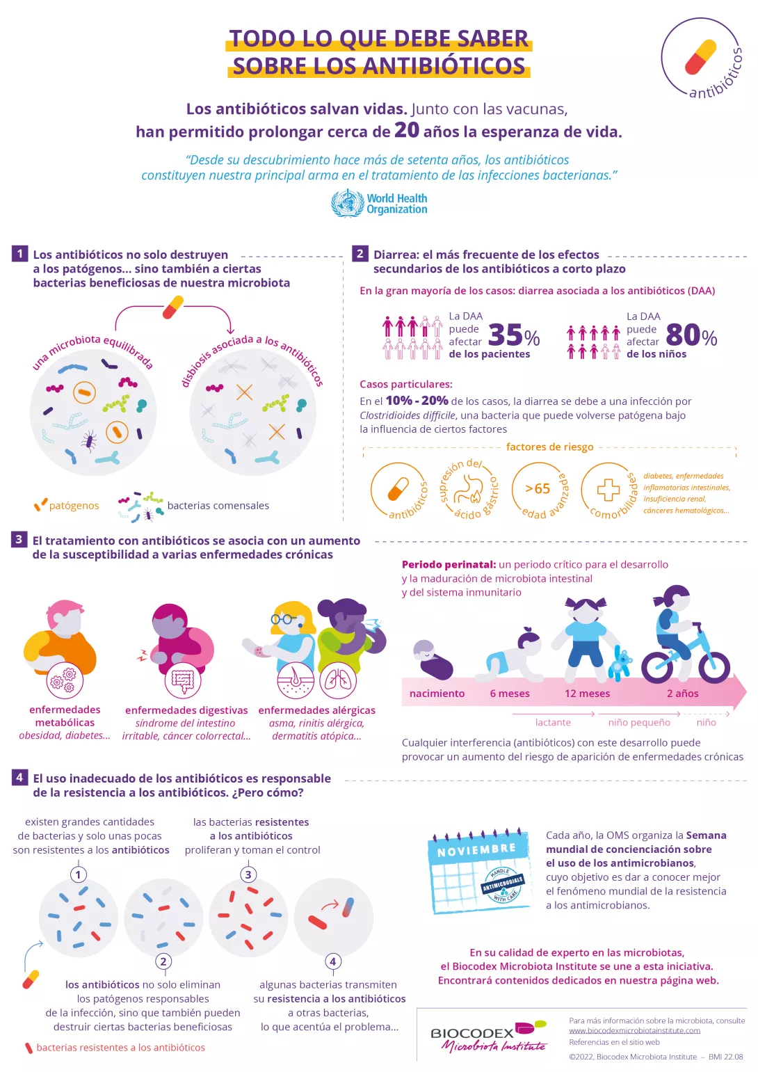 Esta infografía muestra información clave sobre los antibióticos, explicando cómo ayudan a combatir las infecciones, pero también afectan el equilibrio de las bacterias beneficiosas en la microbiota.