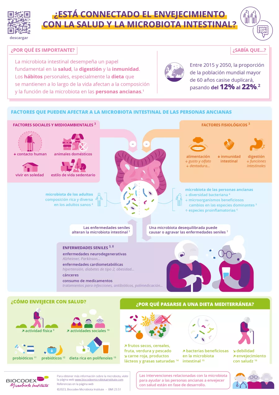 Esta infografía explora la relación entre la microbiota intestinal y el envejecimiento, destacando cómo la alimentación y el estilo de vida influyen en la salud digestiva, la inmunidad y el bienestar general de las personas mayores.
