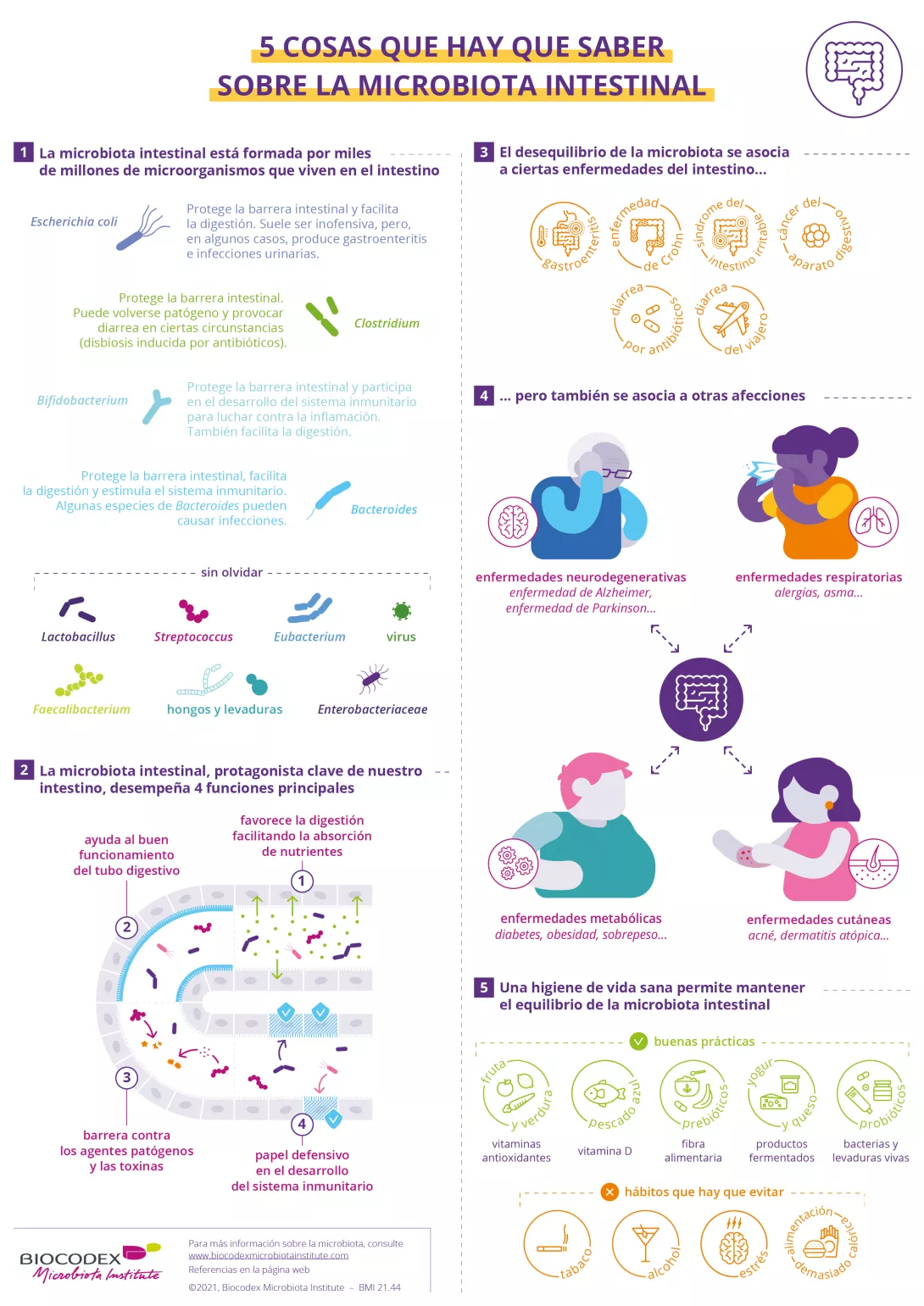 Esta infografía destaca 5 datos clave sobre la microbiota intestinal y su papel fundamental en la digestión, la inmunidad y la salud en general. Explica cómo una microbiota equilibrada favorece el buen funcionamiento intestinal y protege contra patógenos, mientras que un desequilibrio puede estar relacionado con enfermedades digestivas, metabólicas e incluso neurodegenerativas.