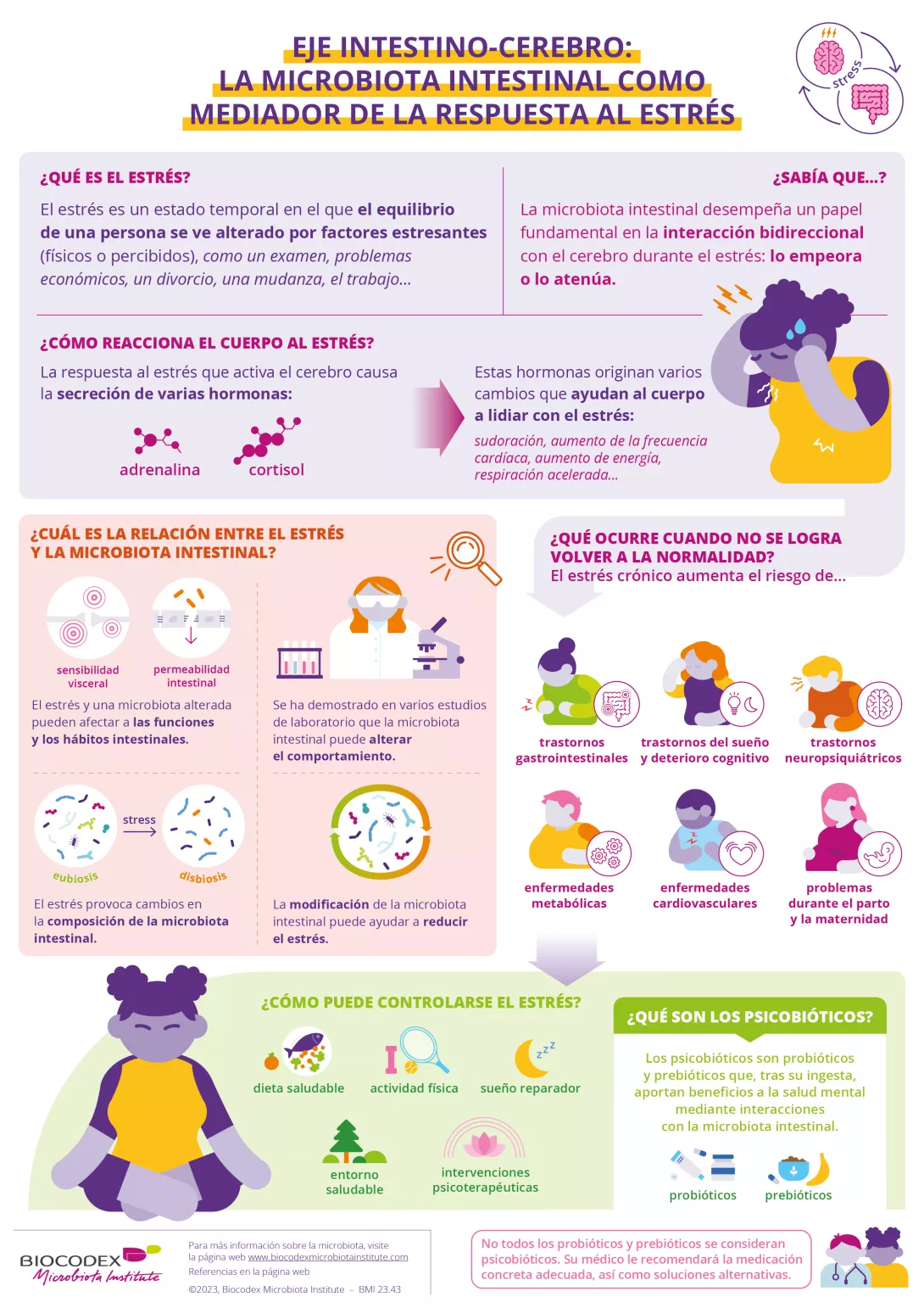 Esta infografía explora la conexión entre la microbiota intestinal y el estrés, destacando cómo el eje intestino-cerebro influye en el bienestar mental y físico.