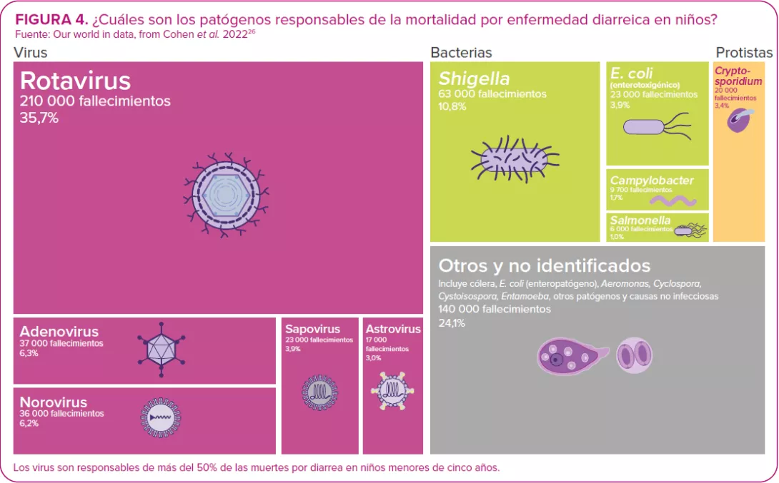 Entre todos los patógenos diarreicos, y a pesar de la disponibilidad de vacunas, el rotavirus sigue siendo la primera causa de mortalidad en niños menores de cinco años.2