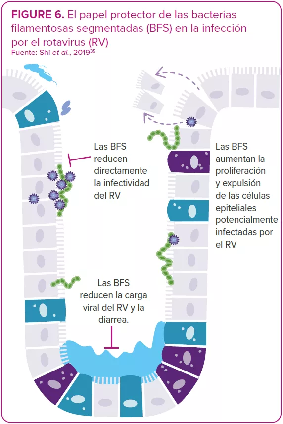 La microbiota intestinal presenta interacciones bidireccionales con las infecciones por rotavirus y norovirus:14 puede proteger de la infección o predisponer al huésped a la infección; a su vez, una infección puede alterar la microbiota intestinal. Algunas bacterias parecen capaces de inhibir la infección viral. Por ejemplo, un estudio muestra que las bacterias filamentosas segmentadas son capaces de prevenir y curar la infección por rotavirus en colonias de ratones35 (Figura 6). Por otra parte, varios estudios in vitro e in vivo indican que la microbiota intestinal está implicada como facilitadora de la infección viral: ciertos microbios intestinales (por ejemplo, Enterobacter cloacae) estimulan la capacidad del norovirus humano para infectar los linfocitos B humanos in vitro; la eliminación de la microbiota con antibióticos retrasa la infección y reduce la infectividad o el título de norovirus y rotavirus en ratones.8,36