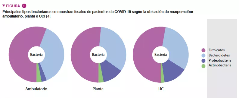 Dado que la comunidad científica ha considerado a la microbiota intestinal un asunto candente por su influencia determinante en las funciones inmunitarias e inflamatorias del anfitrión, decidimos investigar si cambios en la composición de la microbiota intestinal se asociaban a una mayor gravedad clínica de la COVID-19 [4]. Se realizó un estudio multicéntrico transversal en 115 pacientes con COVID-19 clasificados según: 1) lugar de recuperación de la COVID-19: ambulatorio (aislamiento domiciliario), en planta o en UCI; y 2) escala de gravedad de COVID-19: asintomática, de leve a moderada o grave. Los pacientes más enfermos presentaron cambios profundos en la composición de la microbiota intestinal, comparados con los pacientes de intensidad leve a moderada en régimen ambulatorio o ingresados en planta (Figura 1). Estos cambios incluían: 1) una menor diversidad microbiana intestinal general; 2) una menor abundancia de bacterias beneficiosas productoras de butirato como Roseburia y Lachnospira; 3) una menor proporción de Firmicutes/ Bacteroidetes; 4) una mayor abundancia de Proteobacterias. Además, detectamos el virus en muestras fecales, hecho que debe tenerse en cuenta en las recomendaciones de salud pública [5, 6]. Las publicaciones de otros colegas han demostrado que una baja diversidad podría ser un biomarcador clínico que predijese un mayor riesgo de gravedad [7-9].