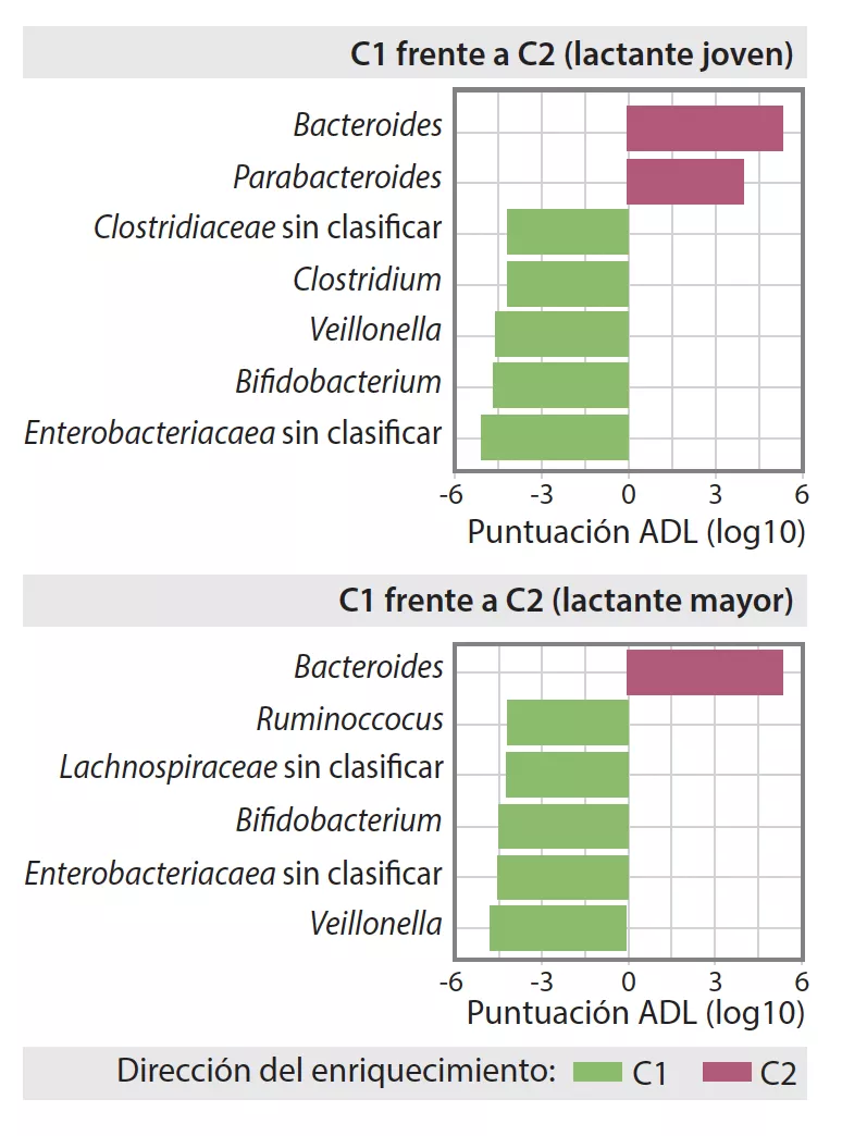 Composición de la microbiota intestinal en las agrupaciones C1 y C2 tempranas o tardías en los lactantes.