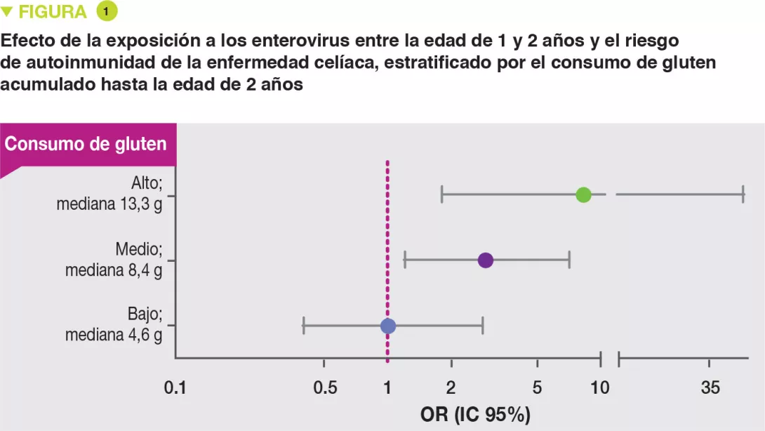 El riesgo de autoinmunidad de la enfermedad celíaca no aumentaba con las infecciones virales que aparecían después de la edad de introducción del gluten, cuando se mantenía la lactancia materna. En cambio, después del destete, en las muestras de heces recogidas entre los 1 y los 2 años, cuando se había introducido el gluten, existía una relación entre el número acumulado de virus (OR 1,41; p = 0,05) y de enterovirus encontrados (OR 2,47; p = 0,03) y el riesgo de autoinmunidad de la enfermedad celíaca. Existía una interacción significativa entre la presencia de enterovirus encontrados entre los 1 y los 2 años y la cantidad integrada de gluten hasta los 2 años sobre el riesgo de autoinmunidad de la enfermedad celíaca (p = 0,30). Este riesgo aumentaba con la cantidad ingerida de gluten: alta (OR 8,3), media (OR 2,9) y baja (OR 1,0) (Figura 1).
