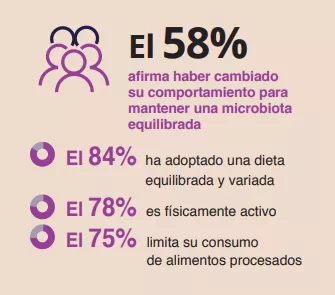- La gran mayoría de los encuestados afirma haber adoptado comportamientos adecuados, aunque a menudo admiten haberlo hecho solo de manera parcial. Una gran mayoría afirma que sigue una alimentación equilibrada y variada (el 84 %, pero solo el 33 % lo hace completamente), que realiza actividad física (el 78 %, pero solo el 35 % afirma que lo hace completamente), que evita fumar (el 76 %) o que limita el consumo de alimentos procesados (el 75 %, pero solo el 26 % afirma hacerlo completamente) para limitar el riesgo de una microbiota desequilibrada.