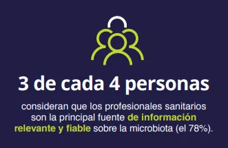 - Los profesionales sanitarios son la fuente más creíble de información: más de 3 de cada 4 encuestados creen que los profesionales sanitarios son la fuente más fiable de información sobre la microbiota (el 78 %; primera fuente mencionada).