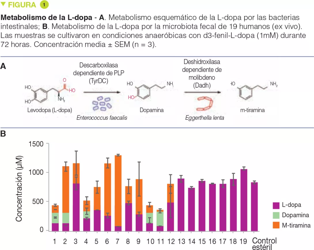 Los autores tomaron como hipótesis que la descarboxilación de la L-dopa podría necesitar una enzima dependiente del piridoxal fosfato (PLP). Seguidamente analizaron los genomas de las bacterias intestinales e identificaron una tirosina descarboxilasa conservada (TyrDC) en Enterococcus faecalis (Figura 1A). Ciertos experimentos genéticos y bioquímicos revelaron que TyrDC descarboxila simultáneamente la L-dopa y su sustrato preferido, la tirosina. Después, utilizaron métodos de enriquecimiento para aislar una cepa de Eggerthella lenta capaz de deshidroxilar la dopamina (Figura 1A). Un análisis transcriptómico permitió identificar que la enzima responsable de esta actividad es una deshidroxilasa dependiente del molibdeno (Dadh). Inesperadamente, la presencia de esta enzima en la microbiota intestinal no está correlacionada con el metabolismo de la dopamina. De hecho, es un polimorfismo genético en un nucleótido (SNP) en el gen Dadh el que predice la actividad. La capacidad para metabolizar la L-dopa siguiendo esta vía era variable de un individuo a otro (Figura 1B). En la microbiota intestinal de los pacientes con Parkinson, la abundancia de E. faecalis, de TyrDC, y del SNP de Dadh está correlacionada con el metabolismo de la L-dopa y de la dopamina, lo que confirma su pertinencia. Los autores demostraron a continuación que la carbidopa, que inhibe el AADC humano, solo tenía un efecto mínimo en la descarboxilación de la L-dopa por E. faecalis, y un efecto nulo en la microbiota intestinal compleja de pacientes, lo que sugiere que probablemente este fármaco no puede impedir el metabolismo microbiano de la L-dopa in vivo. Dada la preferencia de TyrDC por la tirosina, los autores buscaron moléculas que «imiten» la tirosina. Identificaron la (S)-α-fluorometiltirosina (AFMT) como inhibidor selectivo de la descarboxilación bacteriana intestinal de la L-dopa. La AFMT, administrada conjuntamente la L-dopa y la carbidopa a ratones colonizados con E. faecalis, permitía aumentar la concentración sérica de L-dopa.