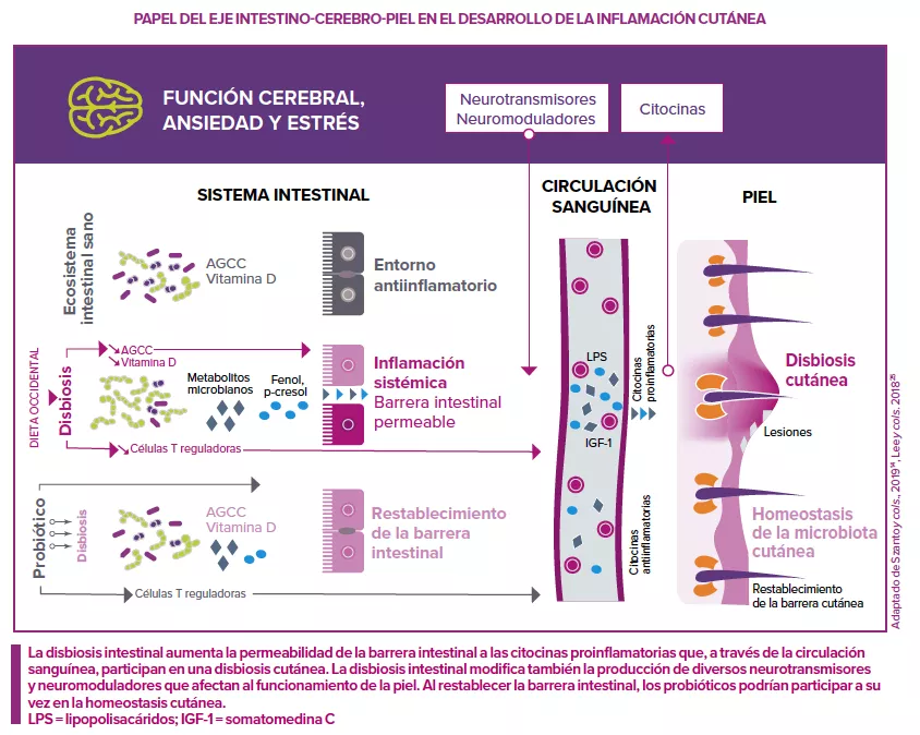 El eje intestino-cerebro-piel podría estar implicado en las enfermedades cutáneas. Por ejemplo, se observa un aumento y una fuerte expresión de la sustancia P (neurotransmisor y neuromodulador del sistema nervioso central y periférico) tanto en el acné como en la disbiosis intestinal. La sustancia P es conocida por desencadenar la expresión de numerosos mediadores proinflamatorios, como los implicados en la patogenia del acné (IL-1, IL-6, TNF-α, PPAR-γ).22 23