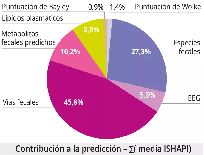 La integración de datos multimodales demostró que los mejores predictores de DAM a los 12 meses eran: 1) los lípidos plasmáticos (AUROC = 0,95 0,05); 2) las mediciones cerebrales y conductuales (puntuación de Wolke, EEG, puntuación de Bayley) (AUROC = 0,73 0,05, 0,71 0,10, 0,68 0,07 respectivamente); 3) el perfil taxonómico, funcional y de metabolitos predichos del microbioma fecal (AUROC = 0,56 0,07, 0,53 0,07, 0,52 0,06). Hay que señalar que el microbioma fecal desempeña una función importante en la predicción de la DAM en el análisis multimodal, a pesar de los malos resultados del microbioma fecal (figura 3).