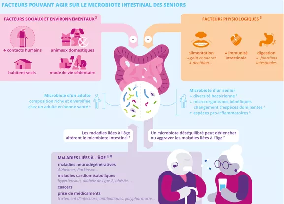 L’avancée en âge est généralement associée à une altération du microbiote intestinal. Avec le temps, ce dernier a tendance à perdre sa diversité et son équilibre (dysbiose), contribuant ainsi à une accentuation des processus inflammatoires et à une susceptibilité accrue aux maladies qui fragilisent les personnes âgées.