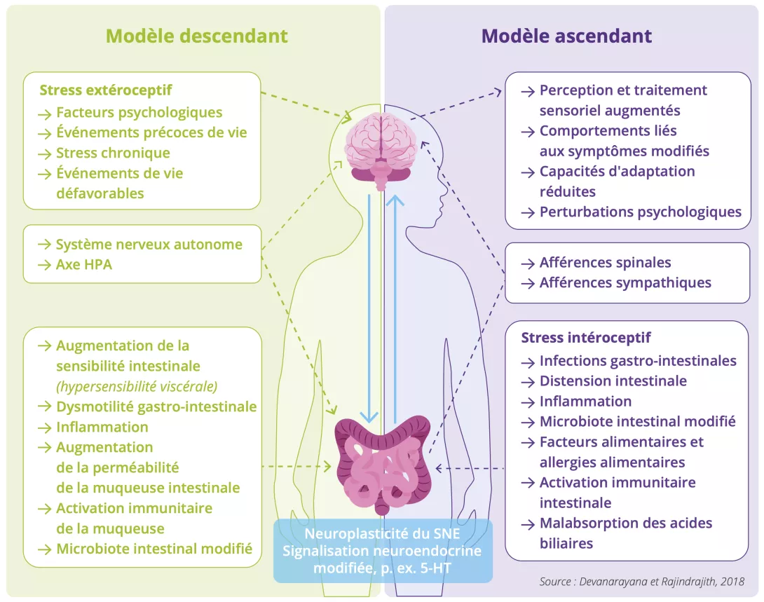 - Le modèle Bottom-up (du bas vers le haut) propose que tout commence dans l'intestin : la maladie de Louise aurait été déclenchée par une infection gastro-intestinale qui aurait généré des messages nerveux d'alerte au cerveau quant à la douleur.