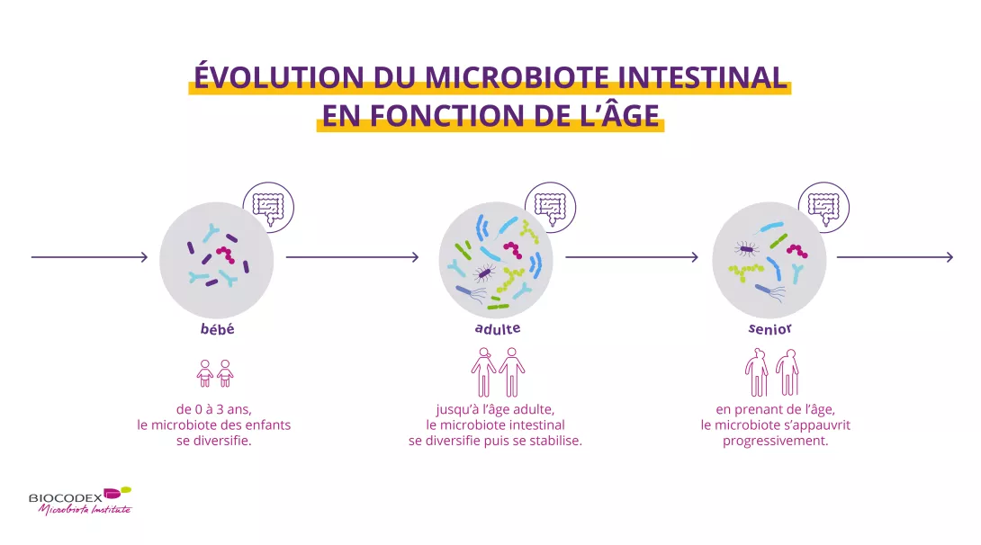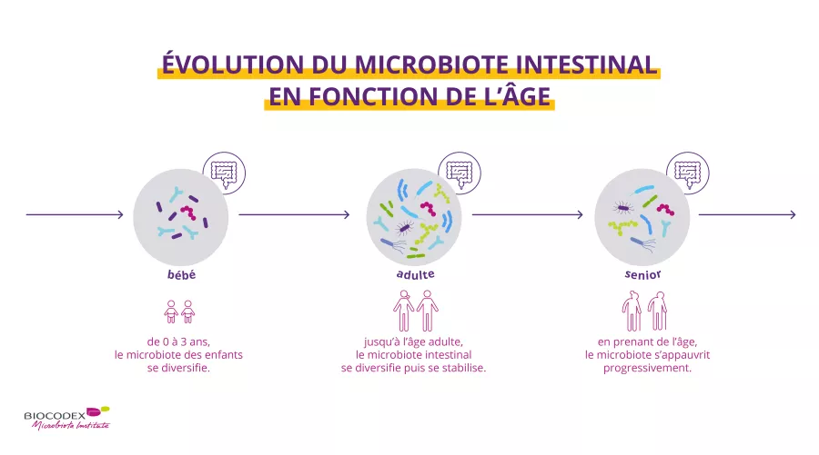 Chacun de nous possède un microbiote unique, un peu comme une empreinte digitale1. À la naissance, les micro-organismes d’origine fécale et vaginale transmis par la mère au cours de l’accouchement par voie basse, ou les micro-organismes de l’environnement en cas de césarienne3, induisent le démarrage de la colonisation du microbiote intestinal4. Celui-ci met environ trois ans à se former, à se diversifier et à se stabiliser5. À l’âge adulte6, sa composition reste relativement stable jusqu’à la vieillesse, lorsqu’il il subit une profonde transformation dont il ressort quelque peu appauvri7.
