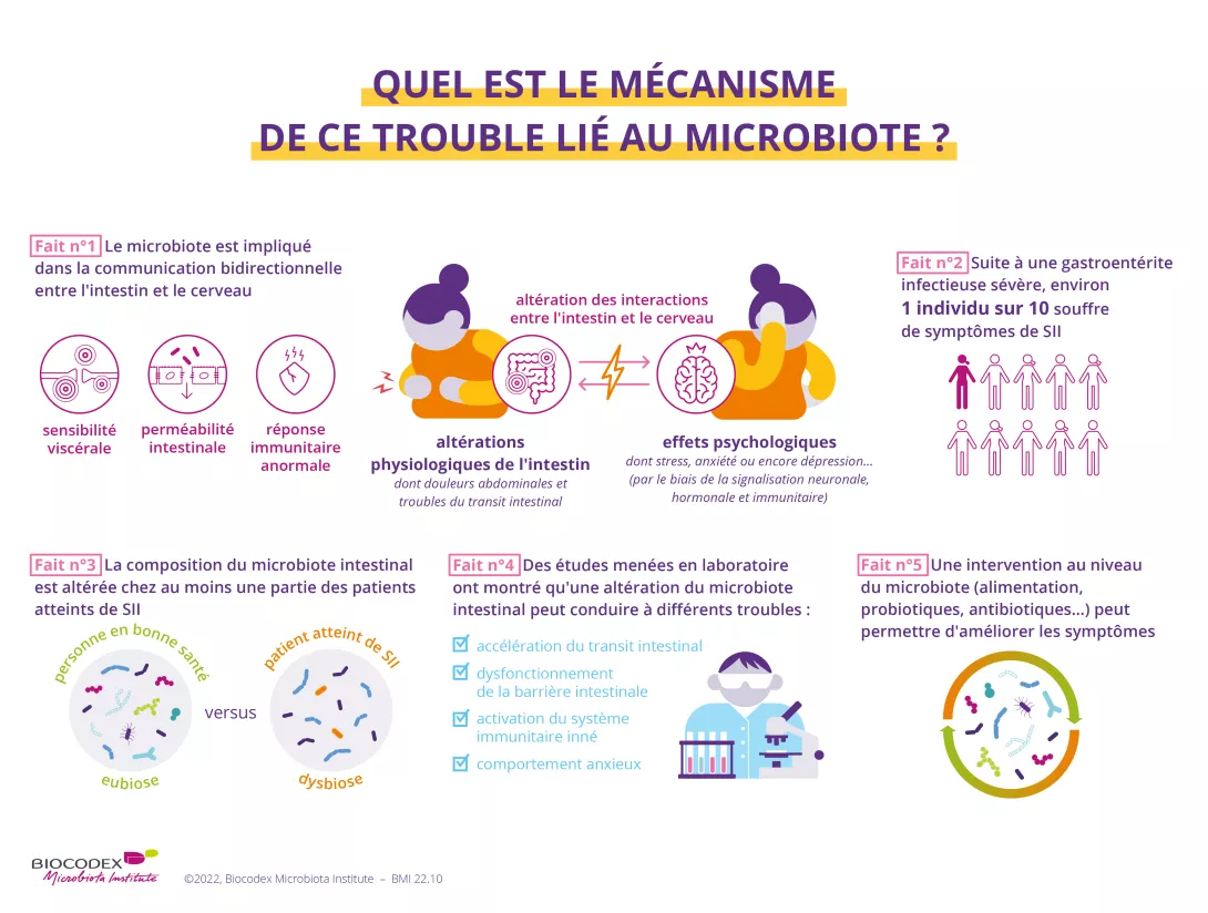 Les dernières recherches sont de plus en plus formelles : le microbiote intestinal jouerait un rôle clé dans l’apparition du SII : 6,7 un déséquilibre de la composition du microbiote intestinal, ou dysbiose, est même reconnu par les experts comme une cause plausible de SII. 5 Les dysbioses dues à la prise d’antibiotiques ont d’ailleurs également été associées au développement du SII. 1