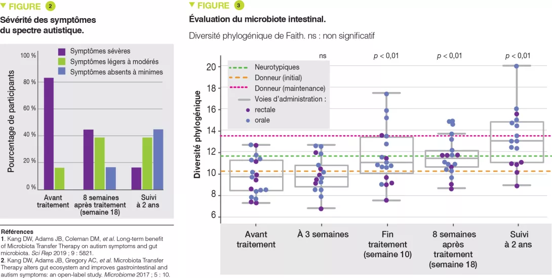 Les enfants autistes souffrent de divers symptômes gastro-intestinaux (constipation, diarrhée, ballonnement). En outre, il existe chez les enfants autistes une dysbiose du microbiote intestinal caractérisée par une augmentation du ratio Firmicutes/ Bacteroidetes en raison d’une diminution des Bacteroidetes. Cette dysbiose perturberait l’axe intestin-cerveau, et favoriserait à la fois les symptômes digestifs et comportementaux liés à l’autisme. Le traitement par transfert de microbiote comprend une préparation digestive initiale avec antibiothérapie par vancomycine pendant 14 jours et préparation colique à J15, puis une transplantation fécale avec forte dose initiale de microbiote digestif humain standardisé (par voie orale ou rectale) et faible dose en entretien pendant 7-8 semaines, associées à un traitement par inhibiteurs de la pompe à protons à partir de J12. Kang et al. ont rapporté précédemment que ce traitement a permis une réduction de 80 % des symptômes digestifs et une réduction plus faible des symptômes comportementaux d’enfants autistes, associées à une modification du microbiote intestinal, avec un suivi de 8 semaines [2].