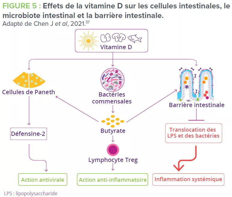 Si la fonction la mieux caractérisée de la vitamine D reste son rôle dans le contrôle des taux de calcium et donc dans la santé du squelette, on sait qu’elle exerce également un effet important sur les réponses immunitaires gastro-intestinales. En effet, la vitamine D régule plusieurs gènes qui, à leur tour, régulent la fonction de la barrière intestinale, ainsi que certains gènes codant pour des peptides antimicrobiens, contribuant ainsi à préserver l’équilibre intestinal (Fig 5)33. Elle exerce un effet immunomodulateur, y compris sur la différenciation des cellules immunitaires, leur migration et leurs fonctions anti-inflammatoires34 ; elle est aussi capable d’agir directement sur les cellules de Paneth afin de stimuler la production de défensine-235. La vitamine D stimule également la diversité de la composition du microbiote intestinal en augmentant la production de butyrate. Le butyrate peut exercer des effets anti-inflammatoires, stimuler le fonctionnement de la barrière intestinale et favoriser la sécrétion de défensines par les cellules de Paneth (Fig 5). Certaines bactéries probiotiques (par exemple, des souches de Lactobacillus) augmentent les taux de vitamine D dans le sang36.