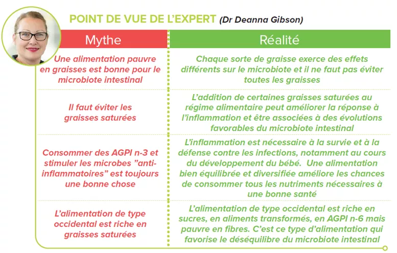 Il y a de nombreuses façons d’exercer une influence sur la composition du microbiote intestinal et de moduler la réponse immunitaire (prébiotiques, probiotiques…)31. Parmi les options existantes, le changement des habitudes alimentaires est capable de modifier l’activité du système immunitaire local, facilitant ainsi le contrôle de l’inflammation accrue qui accompagne ces maladies. Ce type d’intervention porte le nom d’immunonutrition32. Les immunonutriments les plus largement étudiés sont les acides gras polyinsaturés oméga-3 (AGPI n-3), la vitamine D, l’arginine, les nucléotides et la glutamine32.