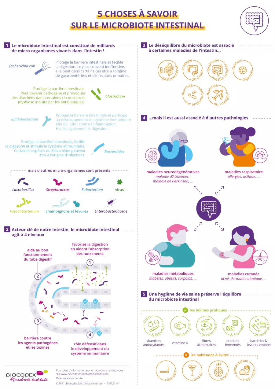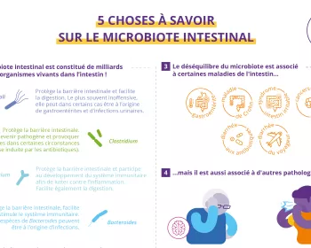 Cette infographie présente 5 faits essentiels sur le microbiote intestinal, son rôle clé dans la digestion, l'immunité et la santé globale. Elle explique comment un microbiote équilibré favorise le bon fonctionnement intestinal et protège contre les agents pathogènes, tandis qu’un déséquilibre peut être associé à des maladies digestives, métaboliques et même neurodégénératives.