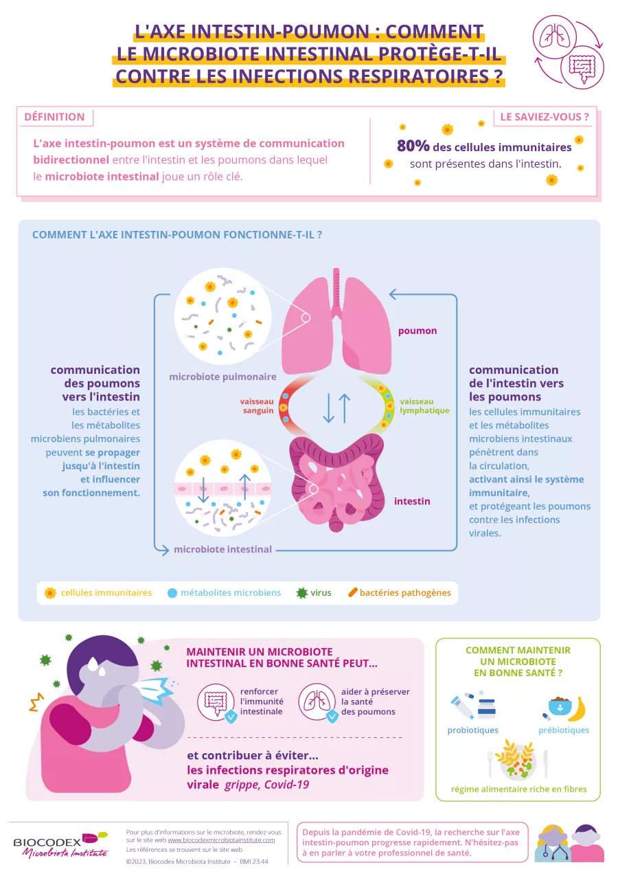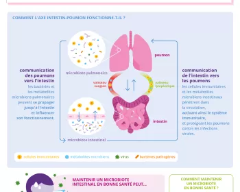 Cette infographie illustre l’axe intestin-poumon, expliquant comment le microbiote intestinal module les réponses immunitaires pour protéger contre les infections respiratoires. Elle met en avant la communication bidirectionnelle entre l’intestin et les poumons.