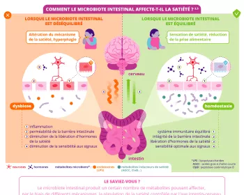 Cette infographie aide les professionnels de santé à expliquer à leurs patients comment le microbiote intestinal influence la satiété.