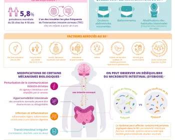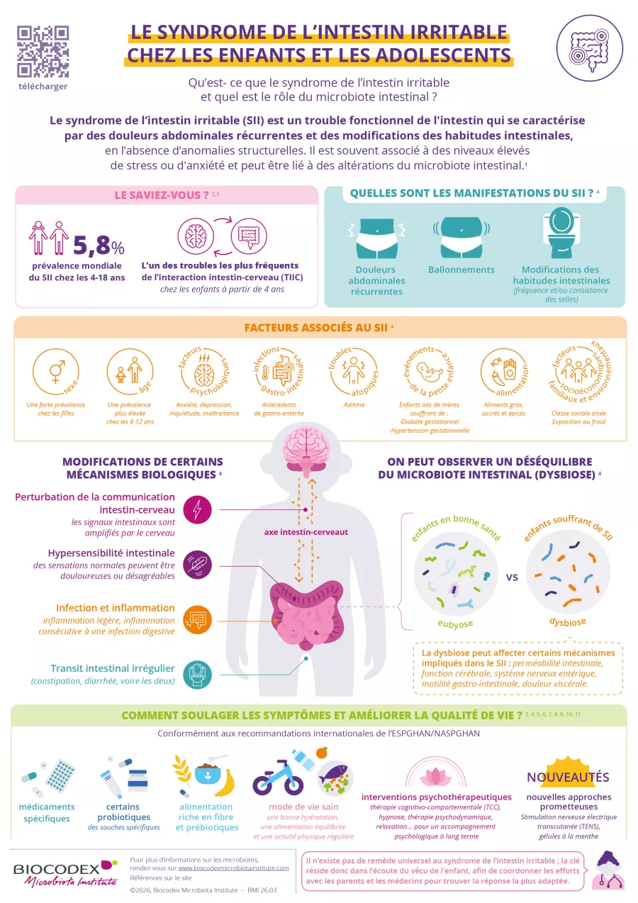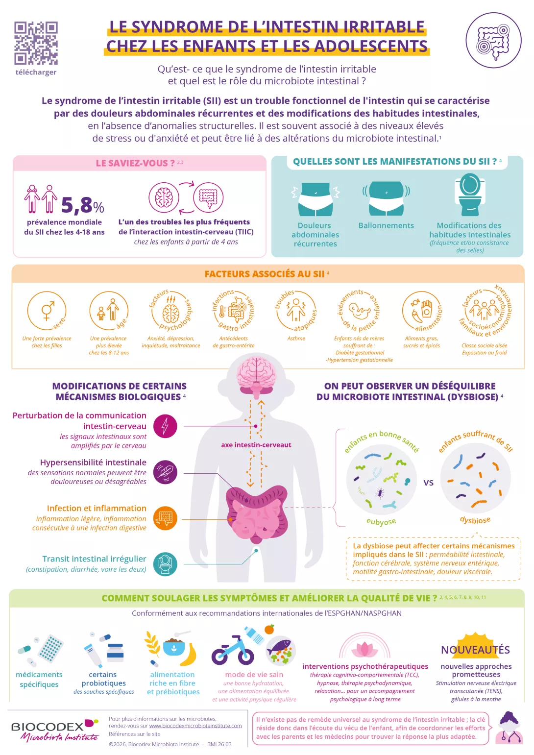 Cette infographie explore le syndrome de l’intestin irritable (SII) chez l’enfant et l’adolescent, un trouble fréquent de l’interaction intestin-cerveau caractérisé par des douleurs abdominales récurrentes et des troubles du transit.