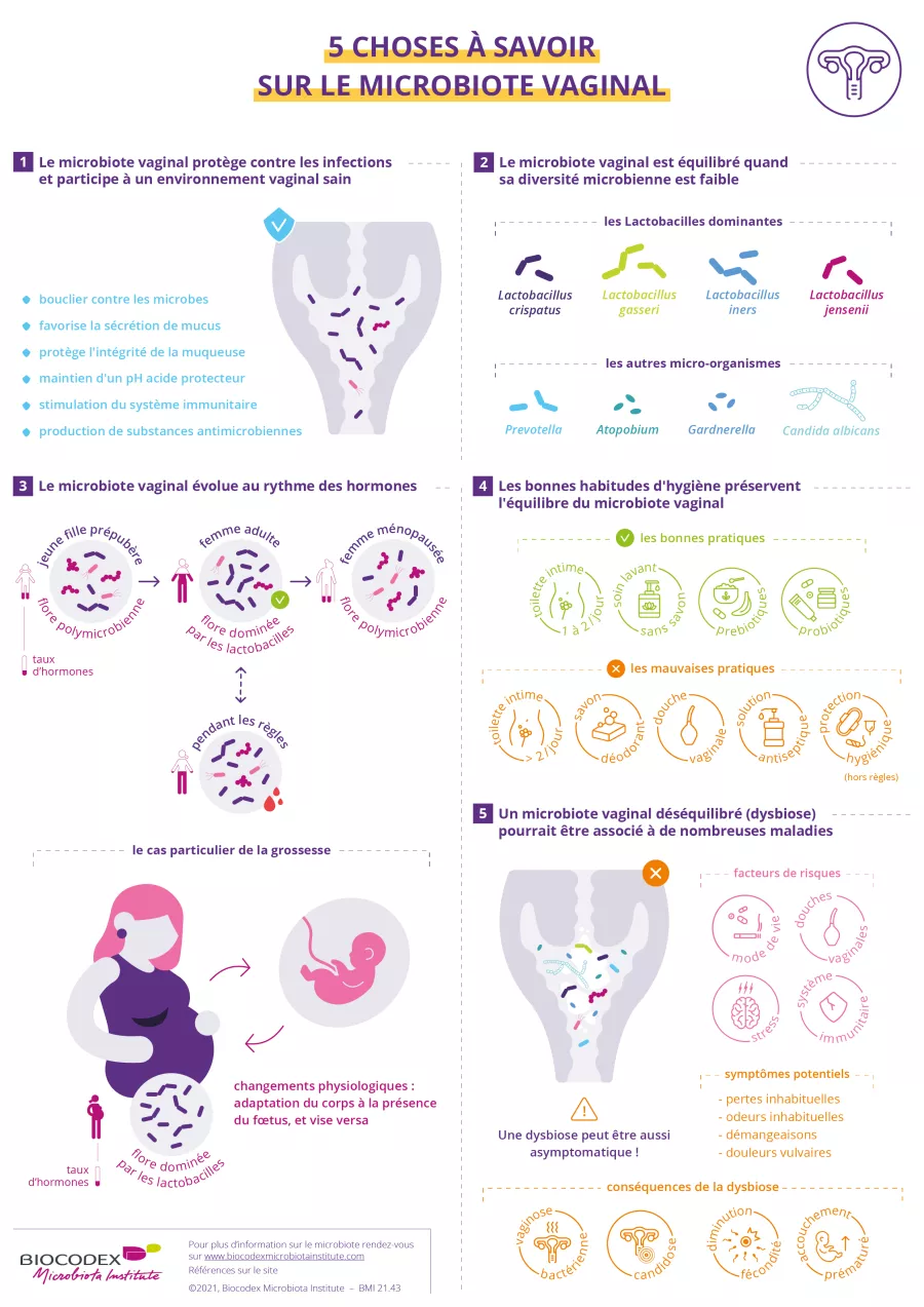 Cette infographie présente 5 éléments essentiels à connaître sur le microbiote vaginal, notamment son rôle dans la protection contre les infections et l'influence des changements hormonaux sur sa composition.
